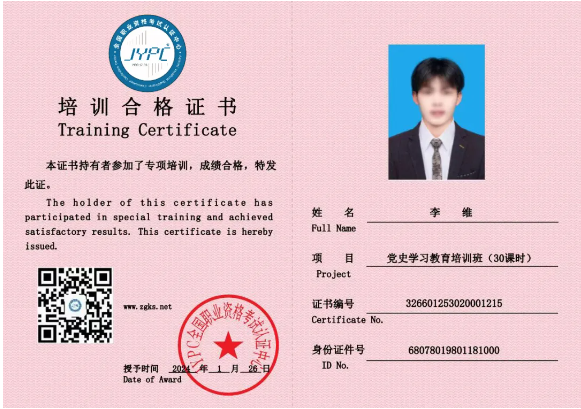 6、培训合格证书,培训合格证书是证明经过培训后,学员已经掌握相关知识和技能的重要凭证。通过获得培训合格证书,学员可以向雇主或潜在雇主展示自己的专业能力和知识水平。培训合格证书,是参加继续教育的凭证,也是获取注册职业资格证书或职业技能等级证书的参考资料。如,党史学习教育培训、干部能力提升培训、行政管理能力培训等。